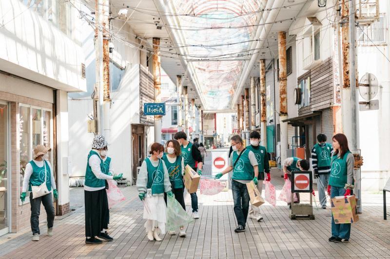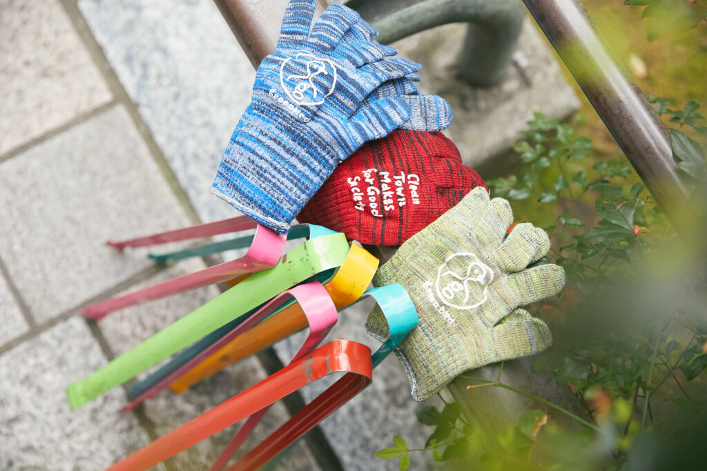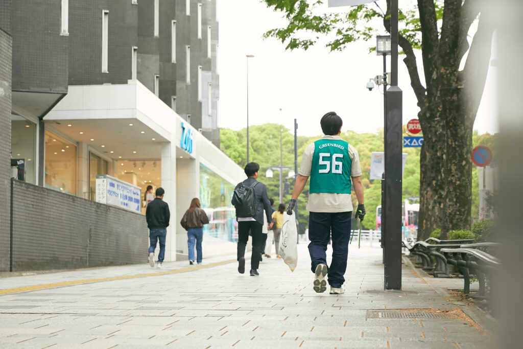 背番号入りの緑色のビブスを着て、再生繊維でできた手袋をはめ、カラフルにペイントされたトングを手に持ち、生垣や路肩に捨てられたゴミを一つひとつ拾っていく。
