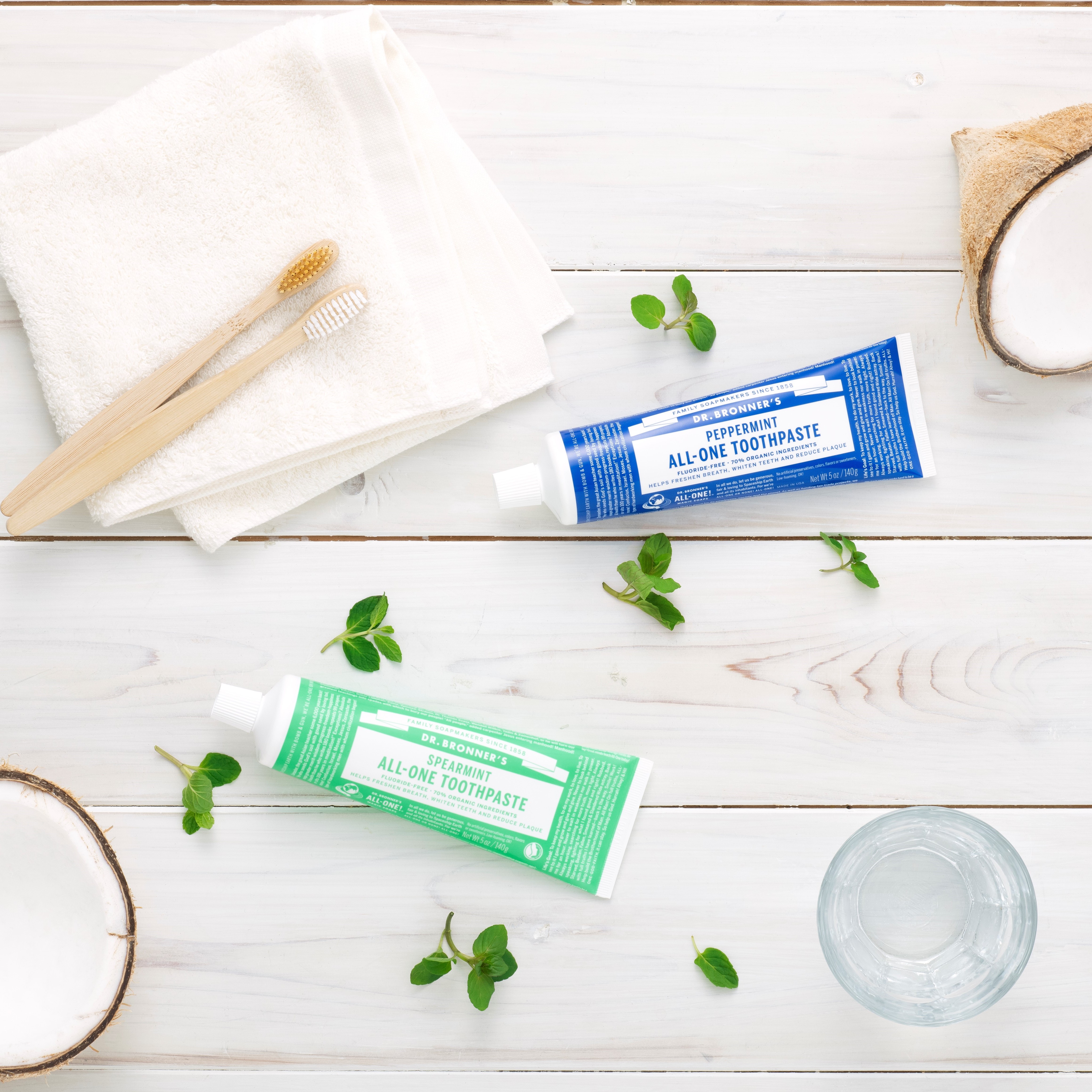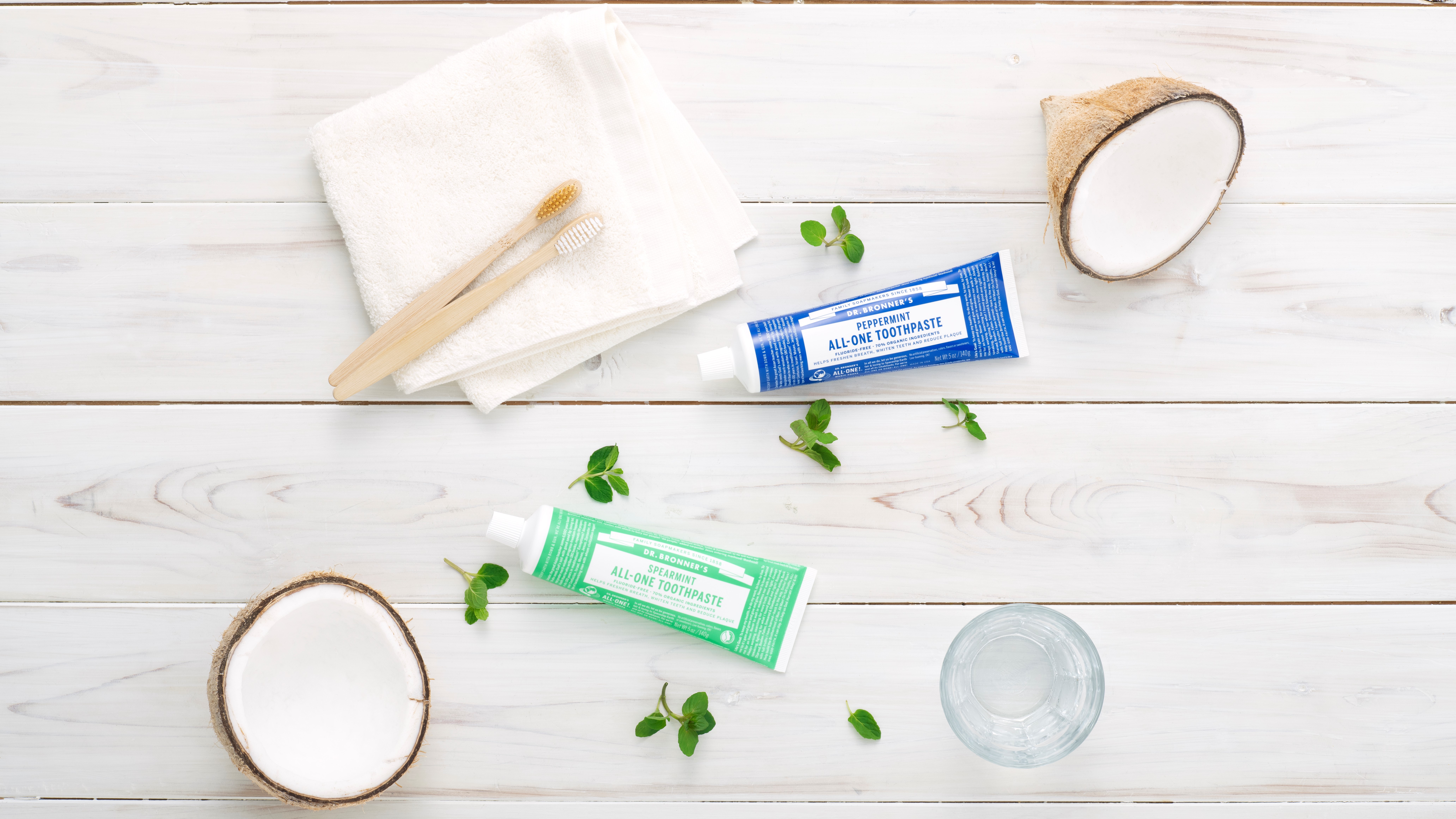 本当に必要なものだけ、自然からの恵みだけ、それがドクターブロナーのオールワントゥースペーストです。研磨を目的とする研磨剤、発泡剤、合成界面活性剤、合成保存料、甘味料、合成香料、フッ素化合物は使用していません。