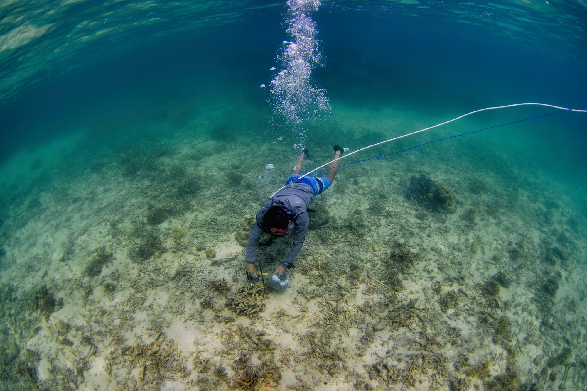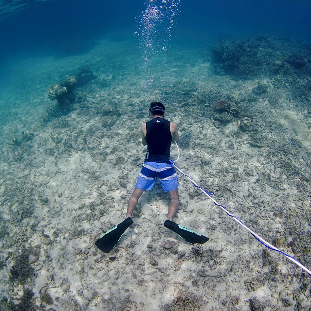 何よりうれしいのが、海の中をじっくりと眺めていられること。苦しい思いをしながら何十回も素潜りを繰り返すと、疲れで思考も曖昧になりがちでしたが、水中での滞在時間が長くなり新たな発見や考察につながっています。このワイヤーなども新たに調達できたので、サンゴの集積がこれからどうなるか楽しみです」