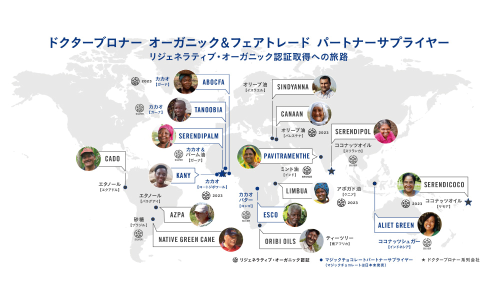 「オールワンビジョン」を企業理念に掲げ、現在40か国で販売されるドクターブロナーは、インターナショナルでされるナチュラルソープブランドとして常に責任ある行動を心がけています。そんな私たちがなぜ、原材料の供給源をフェアトレードとリジェネラティブ・オーガニックへと切り替えたのか。その経緯について、ゲロ氏はこう話します。