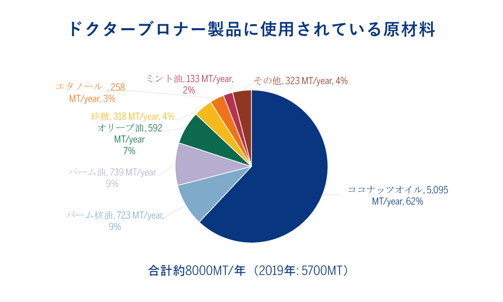 「私たちは1948年の創業以来、ソープにバーム類、歯みがき、クリーンスプレー、チョコレート(日本では未発売)などを作ってきました。そして遡ること20年前、現オーナーであり創業者の孫にあたるデイビッド・ブロナー氏とマイク・ブロナー氏は、“自分たちが作る製品の原材料は、人や地球にとって良いものなのだろうか?”という疑問を持ちます。そこですぐに原材料をオーガニックなものへと切り替えますが、仲介業者が入ることで原材料が果たして本当にオーガニックに作られているのかまでは確認できないうえ、生産業者の安全性や状況は不透明なまま。そんな状況を変えるため2005年、生産者とダイレクトに取引できるだけでなく、原材料の成長をきちんと見届けられ、さらに生産者とコミュニケーションをとりながら、彼らが属するコミュニティとその地域環境にもメリットをもたらすフェアトレードへと移行。複数の垂直統合型プロジェクトに投資もしながら、サプライチェーンそのものの構築と運用へと舵を切ったのです。」