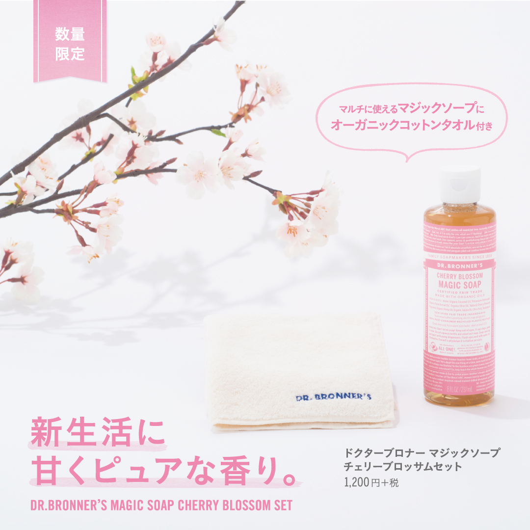 新生活を応援!チェリーブロッサムのマジックソープにオリジナルオーガニックコットンハンドタオルが付いた、春だけの限定セットです。