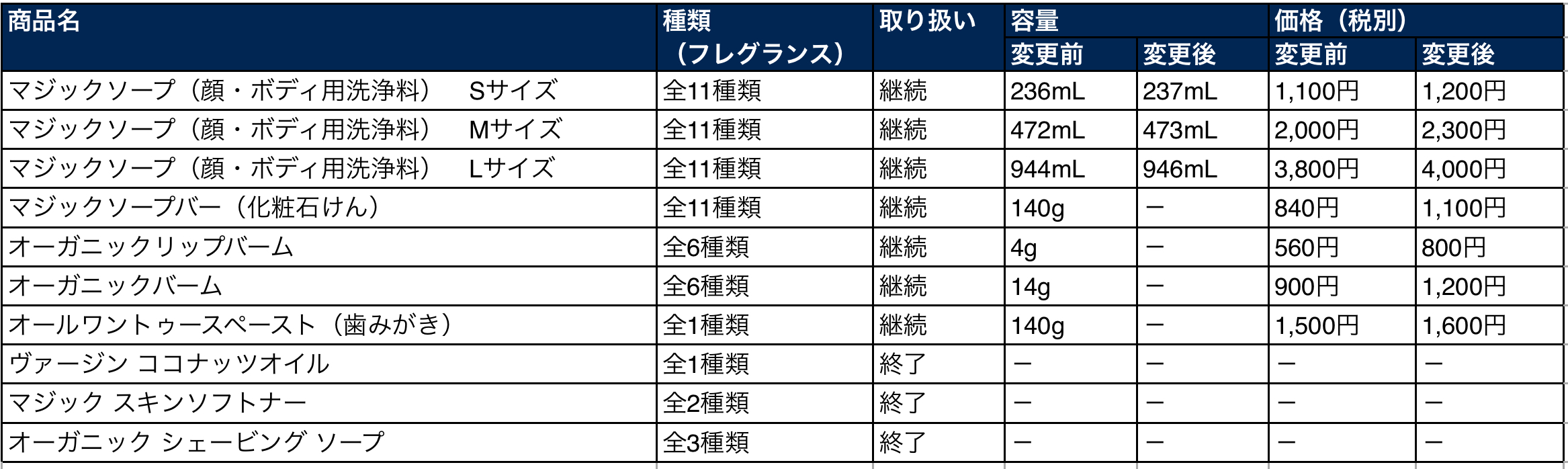 下記の通り、取扱商品、容量、価格が変更となります。