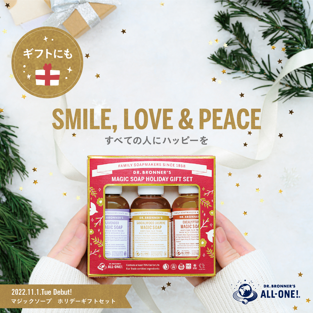 ドクターブロナー製品を贈ることは、プレゼントするあなたも、受け取るあの人も、さらに原材料を育てているフェアトレード先の人々や地球もハッピーにします。幸せの連鎖が起きるドクターブロナー製品を、ぜひ選択肢の1つに選んでみませんか?