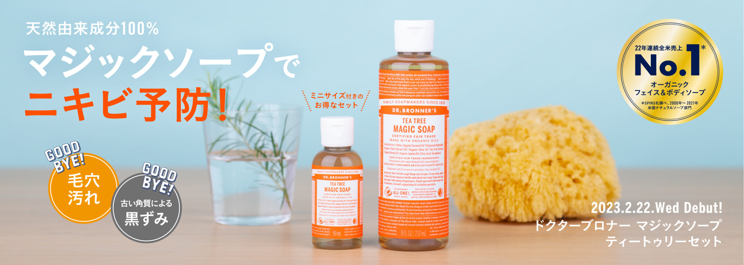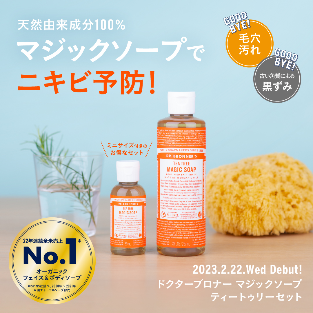 世代を問わず気になるニキビの予防ができ、毛穴汚れや古い角質が原因のくすみもすっきりオフするオーガニックソープ「ドクターブロナー マジックソープ ティートゥリー」が期間限定のミニサイズ付きで登場します!