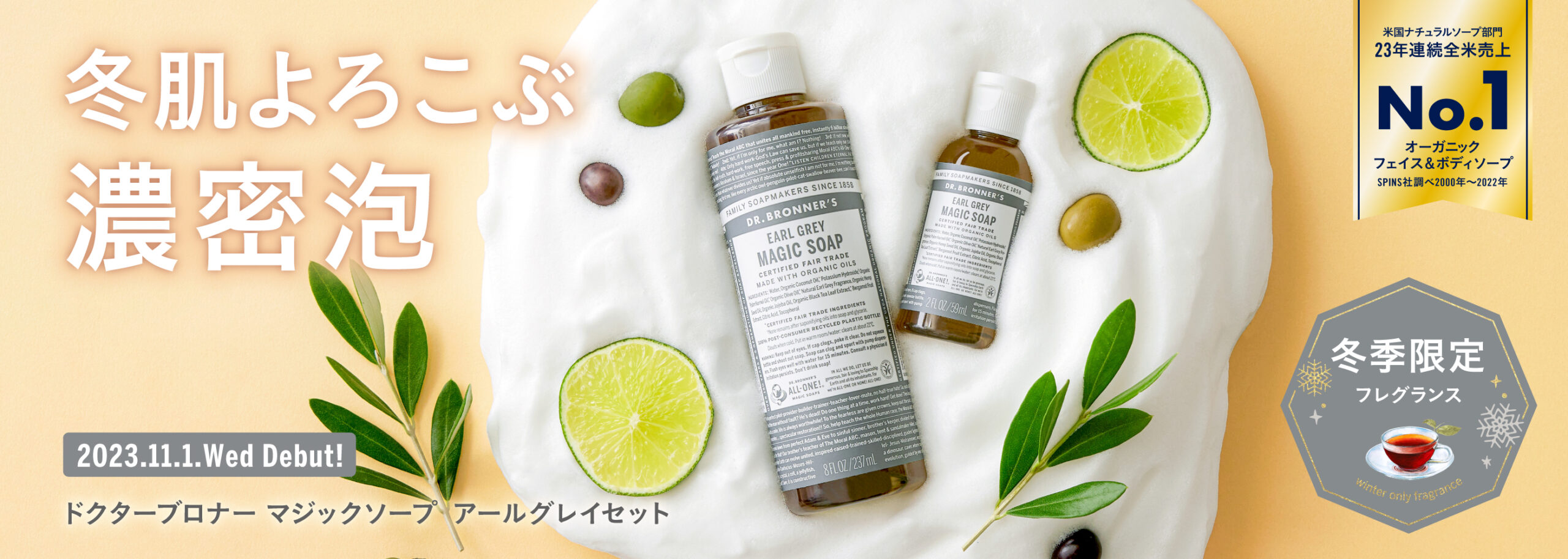 顔も体も1本で洗える、天然由来成分100%のオーガニックソープ「マジックソープ」。冬にぴったりの泡立ちと香りが特徴の「アールグレイ」の香りは、毎年ラブコールを受けている知る人ぞ知るフレグランスです。