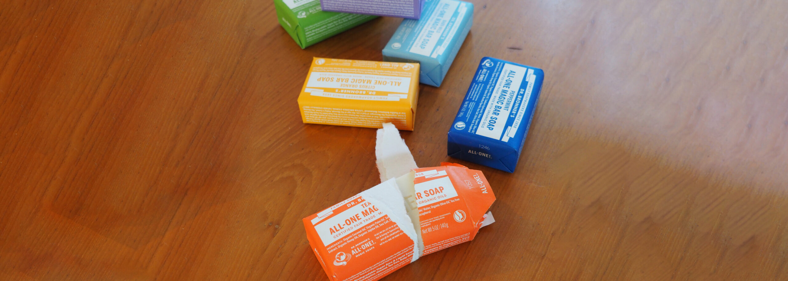 ドクターブロナーのマジックソープバーは環境配慮の観点から、100%再生紙にベジタブルインクでカラー印刷をした包剤を使用しています。