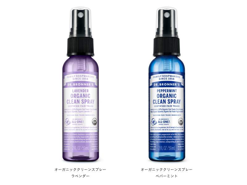 皆さまにご愛顧いただいておりました「ドクターブロナー オーガニッククリーンスプレー」は、日本国内取扱い終了に伴い、現在の在庫をもちまして販売終了となります。